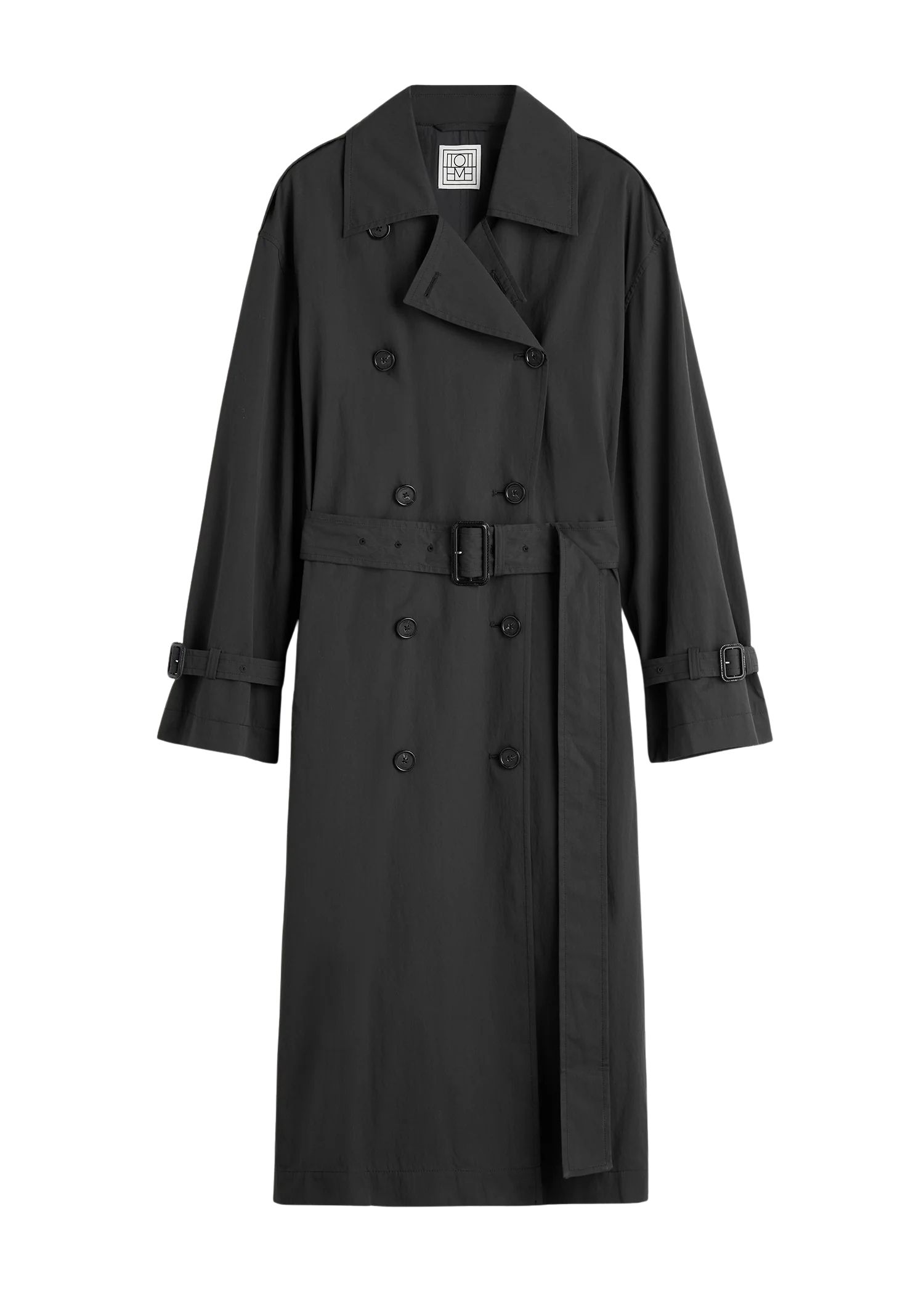 Esta gabardina TOTEME Garderob* presenta un tono negro desteñido que contrasta con nuestra paleta monocromática. Confeccionada en algodón fresco lavado en prenda para lograr un aspecto desgastado y aterciopelado, y cuenta con una solapa trasera inspirada en nuestro distintivo corte en A. Observe cómo el pliegue invertido está reforzado con una sutil puntada en T.