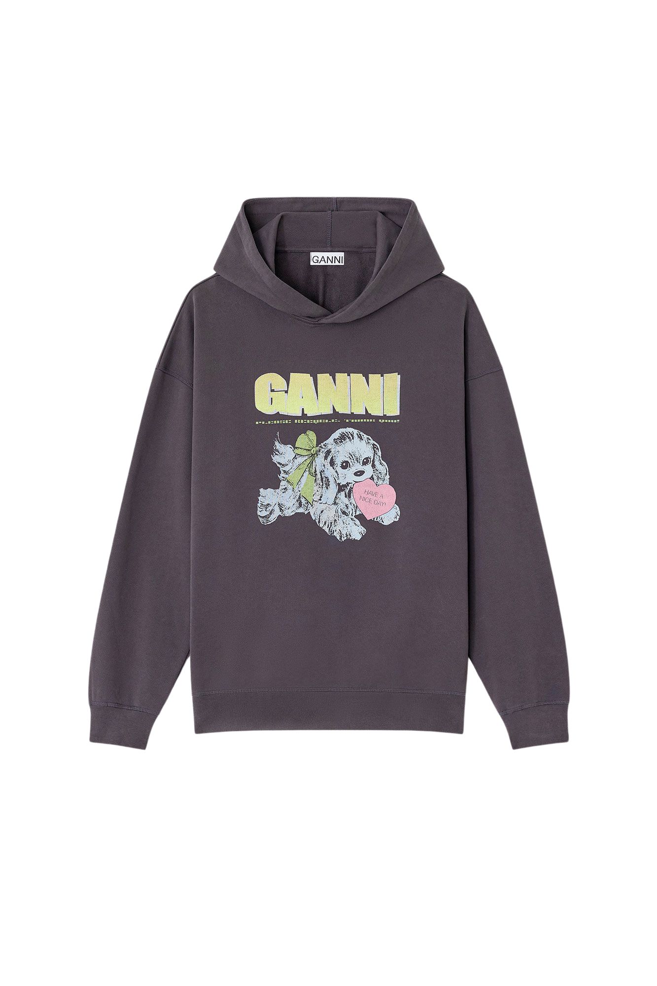 Esta sudadera con capucha presenta una capucha, un estampado de cachorros y el logotipo de Ganni.