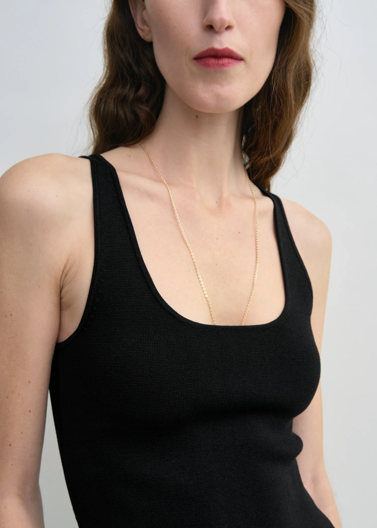 Nota del diseñador: “Esta camiseta TOTEME ha estado con nosotros durante muchos años y ahora es parte de la colección de Garderob. Lo que nos encanta de ella es el escote redondo, fuerte pero atractivo, combinado con una silueta delgada tejida a partir de un jersey compacto, un tejido al que volvemos una y otra vez por la forma en que se ajusta al cuerpo y ofrece una sensación reconfortante de seguridad”.